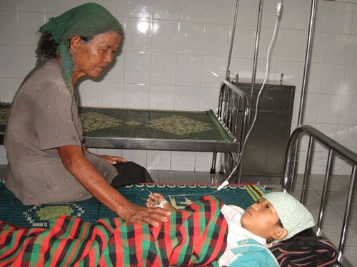 Cháu Kpă H’Liên, 7 tuổi bị ngộ độc vì ăn thịt heo chết đang được điều trị tại bệnh viện khu vực Ayun Pa. Ảnh: Đức Phương