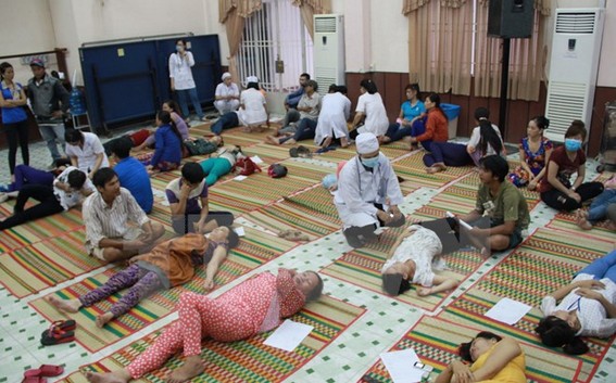Công nhân Công ty Giày Vĩnh Nghĩa, Bình Dương, bị ngộ độc thực phẩm sau khi ăn trưa tại bếp ăn tập thể. (Ảnh: Dương Chí Tưởng/TTXVN)