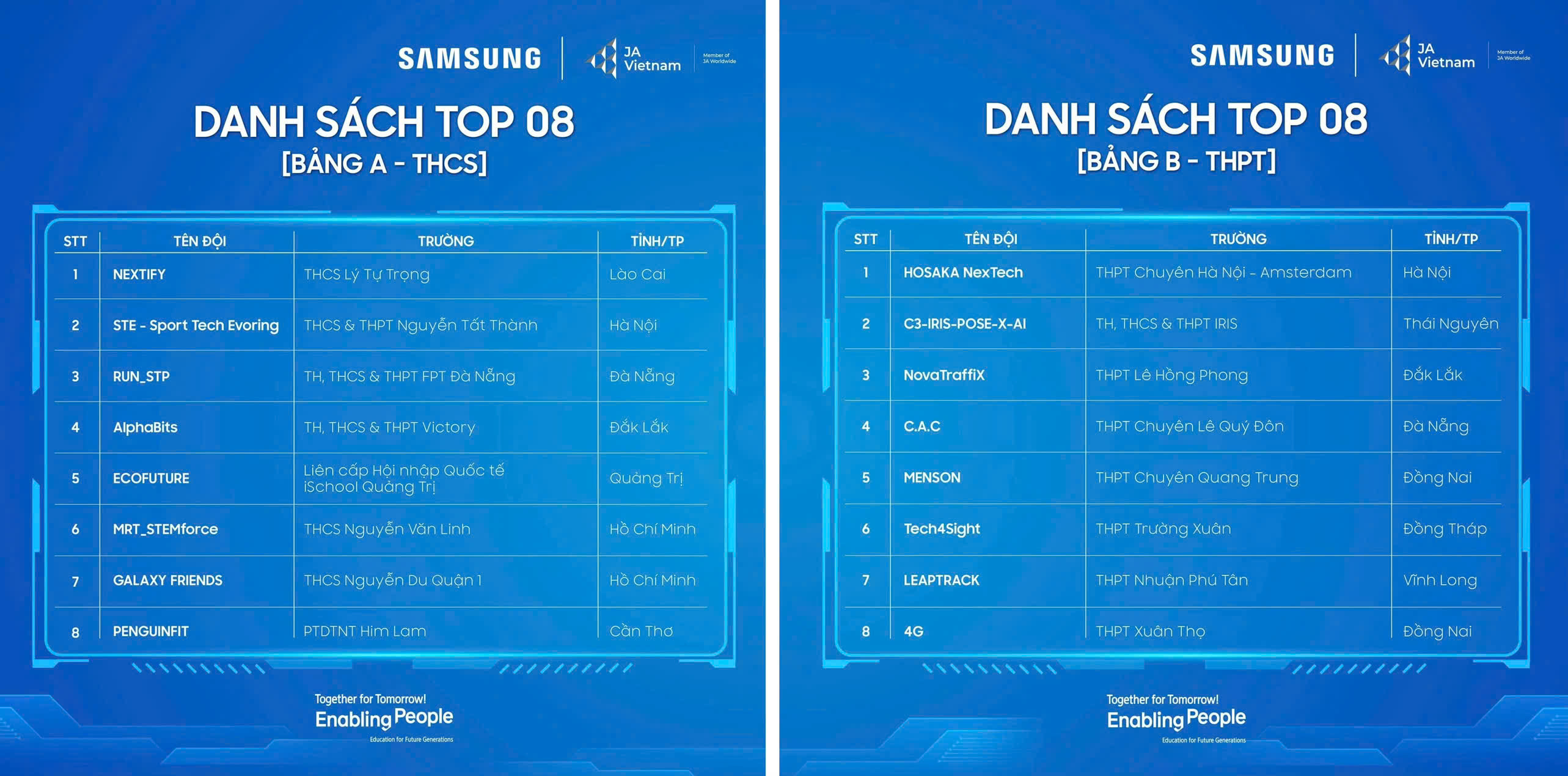 Ngày 2/10, Samsung Việt Nam chính thức công bố danh sách 16 đội thi xuất sắc nhất lọt vào vòng Chung kết Samsung Solve for Tomorrow năm 2025, trong đó bao gồm 8 đội Bảng A (Bảng THCS) và 8 đội từ Bảng B (Bảng THPT).