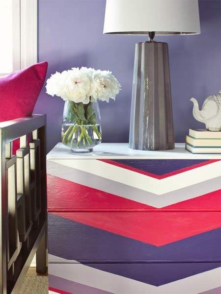 Tủ quần áo là thứ dễ dàng làm mới nhất, đơn giản nhất mà hiệu quả nhất. Chỉ cần sơn bên ngoài các màu của mùa thu ngọt ngào mà chủ đạo là màu tím quả nho. Nhà thiết kế Brian Patrick Flynn đã sử dụng những dải băng để tạo ra chữ V hợp thời trang trên ngăn kéo sau đó lần lượt bổ sung các sắc thái khác nhau của màu tím, màu hồng… chiếc tủ đẹp mắt, ngọt ngào đã hiện ra.