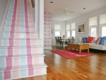 Hãy quên đi những chiếc thảm trải cầu thang cũ kĩ mà tìm cách độc đáo vừa tiết kiệm lại tinh tế khi sơn cầu thang với những sọc dọc nhiều màu. Nhà thiết kế Cortney và Bob Novogratz sơn cầu thang những sọc dày thẳng đứng màu trắng, kết hợp với màu xanh pastel và màu hoa hồng nhạt.