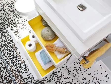 Một bất ngờ khi bạn mở tủ đựng ở nhà tắm ra chính là màu sắc trong ngăn kéo rực rỡ như màu nắng vàng ươm lại không gay gắt của mùa thu. Màu vàng khi kết hợp màu trắng với các hạt gạch nền màu đen giúp ta hình dung như đang chiêm ngưỡng một bông hoa trắng muốt với nhị vàng rung rinh trong sắc nắng, gió trời thu man mát.