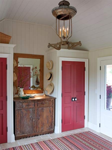 Nhà thiết kế Sarah Richardson đã chứng minh sự đột phá của màu sắc khiến bạn giật mình trong một không gian nhẹ nhàng bằng cách sơn các viền gương màu vàng bí ngô, tủ quần áo màu đỏ. Thiết kế phù hợp với những ngôi nhà ở vùng quê.