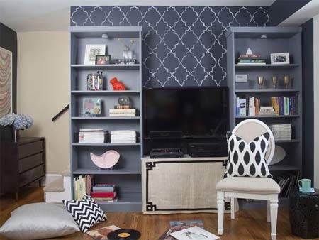 Được thiết kế bởi Brian Patrick Flynn, bức tường ngay lập tức trở nên sống động hơn như một điệu khúc Rhapsody: nhà thiết kế đã dùng những dải cắt khuôn để tạo nên những hình vuông màu xanh tím, đường viền màu trắng. Phụ kiện màu vàng da cam đúng sắc thu với trời tím lam.