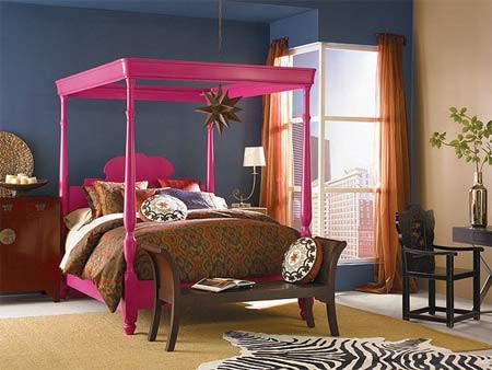 Thêm sự sống động cho phòng ngủ của cô nàng dễ thương một cách bất ngờ, cực ngạc nhiên bằng việc sơn toàn bộ giường, cả khung giường bằng màu hồng đỏ ngọt ngào quả mâm xôi. Không gian này hoàn toàn ngẫu hứng vì sự kết hợp nổi bật của màu hồng này với màu xanh hải quân trên tường.
