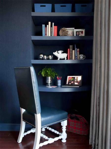 Một cách kết hợp thú vị khi màu ghế cùng với màu sơn tường. Màu xanh chàm tạo ra cảm giác sâu sắc, không gian tinh tế, một cái nhìn ấm cúng nơi góc nhỏ trong phòng ngủ.