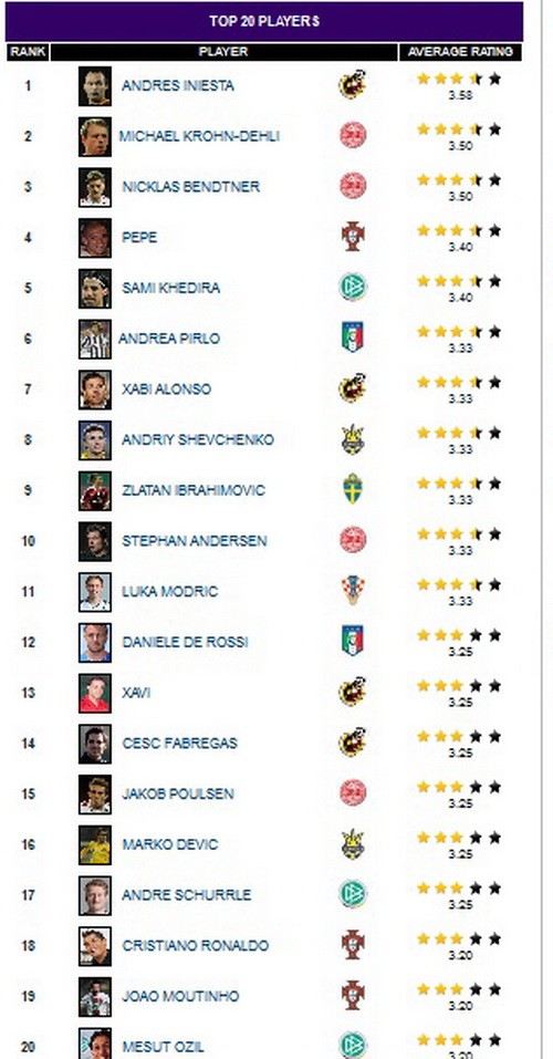 Trong bản danh sách được tờ Goal bầu chọn có tới 10 tiền vệ tính cả Cesc Fabregas dù tại EURO anh được Del Bosque sử dụng như một “số 9”. Ngôi sao của Bồ Đào Nha Cristiano Ronaldo xếp thứ 18, thua người đồng đội Pepe tới 14 bậc.
