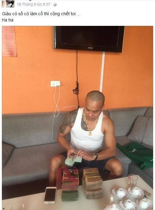Cường luôn chụp ảnh bên những cọc tiền có giá trị lớn rồi đăng tải lên trang facebook cá nhân của mình