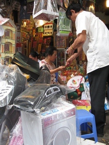 Đến phiên người đàn ông khắc khổ mua hàng mã “hoá” cho đứa con trai chết thảm. Đích thân chị M. bước ra khuyên khéo: “Hai mươi tuổi thì còn chịu chơi hơn. Mua cho cậu ấy chiếc laptop xài đỡ lúc buồn, giới trẻ bây giờ toàn thành phần “hai phai” (Hi-Fi) cả. Đây nữa, bọn trẻ cũng không xem tivi thường nữa đâu mà phải lấy cái LCD này, lúc sống cậu ấy thích “gêm sô” (game show) nào trên truyền hình thì anh chọn màn hình ấy”. Người đàn ông vốn làm công nhân nhà máy dệt gắng gượng: “Bớt cho tôi 60 nghìn, tôi chỉ còn chẵn 500 nghìn thỏi”. Chị M. gật đầu ra chiều thương hại.