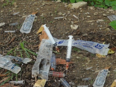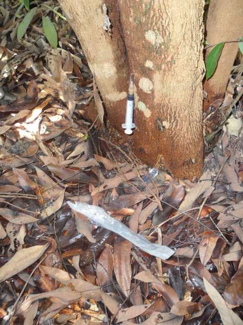 Khi biết chúng tôi muốn tìm hiểu về vấn nạn ma túy ở khu vực này, anh Lê Đình Khánh, một người dân sống gần đó cho biết: "Tưởng gì chứ, cứ đi vào một đoạn nữa là thấy kim tiêm của mấy thằng nghiện vứt lại trắng cả hai bên đường”. Quả đúng như lời anh Khánh nói, dọc hai bên đường vào khu lô 4, túi đựng, vỏ các loại kim tiêm cũ mới, nước cất... được vứt la liệt khắp nơi. Dưới những gốc cây, bụi rậm là hàng chục những ống kim tiêm còn rớm máu tươi cùng một lô những ống nước cất vừa được sử dụng trước đó chưa lâu.