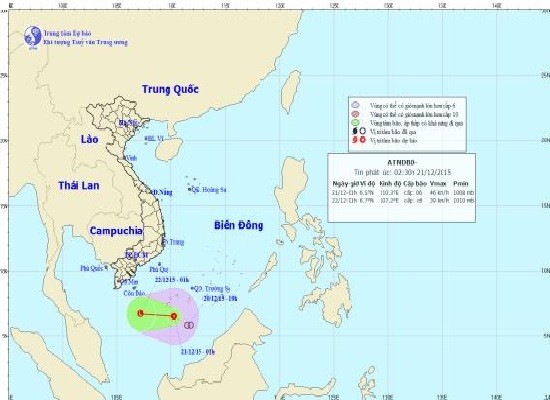Tin tức thời tiết từ Trung tâm Dự báo Khí tượng Thủy văn Trung ương cho biết, đến 1 giờ sáng nay (21/12), vị trí tâm của áp thấp nhiệt đới ở vào khoảng 6,5 độ Vĩ Bắc; 110,3 độ Kinh Đông, cường độ mạnh cấp 6, giật cấp 7, cấp 8.