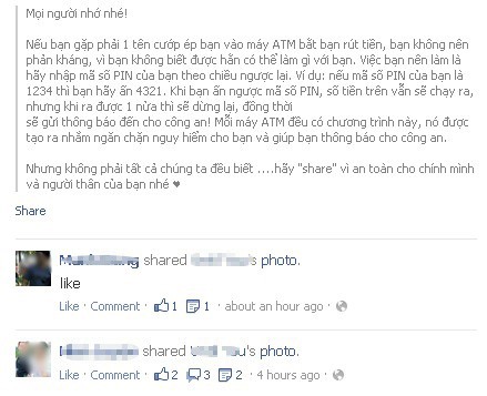 Gần đây, nhiều thành viên trên Facebook và các trang mạng xã hội đang chia sẻ nhau thông tin mà một số người tự cho là "hữu ích" để phòng tránh trong trường hợp bị tên cướp ép rút tiền trên máy ATM. "Không nên phản kháng, vì không biết hắn có thể làm gì với bạn. Việc nên làm là hãy nhập mã số PIN của bạn theo chiều ngược lại. Ví dụ: nếu mã số PIN của bạn là 1234 thì bạn hãy ấn 4321", lời khuyên này cho hay.