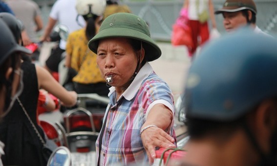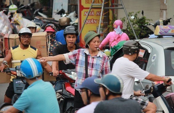Mặc dù không ai đào tạo nhưng các động tác phân luồng, điều khiển giao thông của bà Tiến rất "chuyên nghiệp".