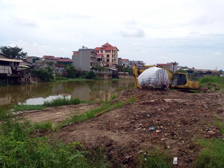 Nhưng tháng 2.2012, Công ty này đã đổ đất cát lấp sông mà chưa thi công tường kè làm sạt chân đê khiến đất ùn ra giữa dòng; ngay cả cột điện cũng bị trôi ra gần 10m so với vị trí ban đầu. Dòng sông Ngũ Huyện Khê vốn rộng trên 60m nhưng giờ chỉ còn khoảng 30m. Không chỉ đặc quánh đất cát, đoạn sông còn bị đơn vị thi công ép máng làm tường kè ra đến giữa dòng. Con đường bê tông kiên cố dẫn vào làng bị "hở hàm ếch" và rạn nứt nhiều nơi do máy xúc cuốc vào chân đê sâu hoắm.