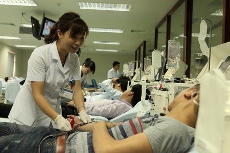 Nhân viên y tế Viện Huyết học và Truyền máu T.Ư lấy máu của người hiến (ảnh chụp chiều 25.4).