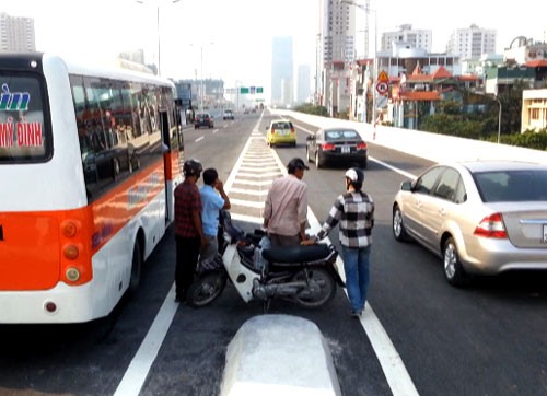 Không chỉ chứng kiến cảnh xe máy đi lẫn với ô tô phóng như bay ở đường cao tốc trên cao, anh Nhân còn không ít lần nhìn thấy cảnh xe khách đón, trả khách ngay trên đường cao tốc này. Cùng với việc xe khách tự ý biến tuyến đường trên cao hiện đại nhất thủ đô thành… bến xe là lực lương xe ôm, xe ba bánh tự chế cũng đua nhau bám theo các xe chở khách để đón khách.