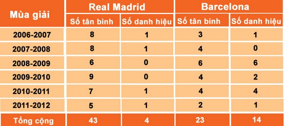 Trong 6 mùa giải vừa qua, Real Madrid đã mua tới 43 cầu thủ, hơn Barca tới 20 cầu thủ. Tuy nhiên, số danh hiệu mà đội bóng áo trắng giành được chỉ là 4 danh hiệu. Còn con số này bên phía Barca là 14 danh hiệu.