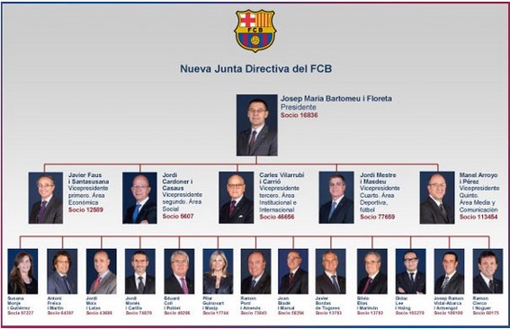 Như vậy, ban lãnh đạo của FC Barcelona sẽ gồm 19 thành viên, gồm chủ tịch Josep Maria Bartomeu, các phó chủ tịch Javier Faus (Kinh tế), Jordi Cardoner (Xã hội), Carles Vilarrubi (Thể chế và Quốc tế), Jordi Mestre (Thể thao) và Manel Arroyo (Truyền thông), cùng 13 thành viên khác, đảm nhiệm các lĩnh vực ngân khố, kỷ luật, di sản, Barca B và đội trẻ, thông tin, y tế, bóng ném, bóng rổ, bóng đá trong nhà, an ninh và hockey trên băng, đào tạo bóng đá, Quỹ FCB và phong trào quần chúng.