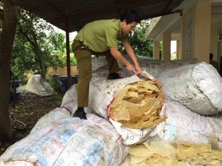 Sáng 13/4, ông Trần Thế Hùng - Đội trưởng đội quản lý thị trường số 20 (thuộc Chi cục Quản lý thị trường Thanh Hóa) cho biết: Đội quản lý thị trường số 20 vừa kiểm tra, phát hiện và tịch thu hơn 2 tấn bì lợn mới qua sơ chế, bốc mùi hôi thối, không có nguồn gốc xuất xứ. Số bì lợn trên đang được vận chuyển từ Hưng Yên vào thành phố Hồ Chí Minh tiêu thụ.