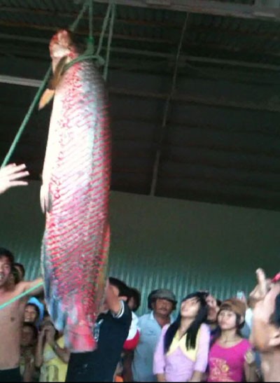 Sau hơn 4 giờ, anh Dẽo cùng một số người khác mới bắt được con cá. Cá có vảy to, màu đỏ rực, dài 1,8 m, cân nặng gần 70 kg. Sau đó, con cá này chết và được chuyển đến Chi cục Thủy sản tỉnh An Giang để nghiên cứu. Cơ quan chức năng xác định đây là cá huyết rồng, một loài cá nước ngọt và có tên trong Sách đỏ của thế giới.