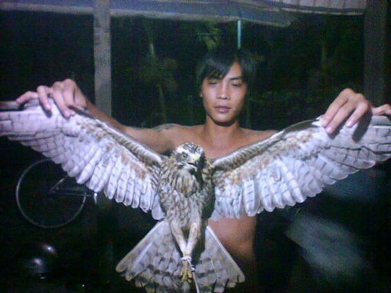 Vào khoảng 20h ngày 9.11, anh Bình đã bắn bị thương và bắt được một con chim lạ có hình dáng và bộ mặt rất giống với chim ưng, sải cánh khoảng 1m, móng vuốt và mỏ rất sắc bén. Trong khi bắt, anh đã bị chân nó quắp đến chảy máu tay.