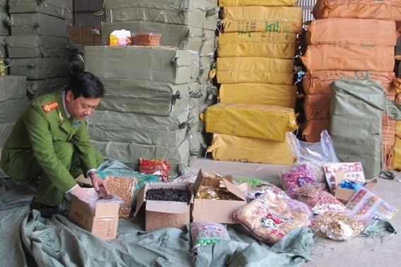 Lực lượng chức năng đang kiểm tra số hàng hóa gồm: ô mai và hoa quả khô, thu giữ được tại khu vực chợ Ninh Hiệp (Ảnh: Đức Duy/Vietnam+)