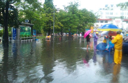 Nước ngập bờ hồ Hoàn Kiếm sau trận mưa ngày 8/8. Ảnh: Việt Nguyễn.
