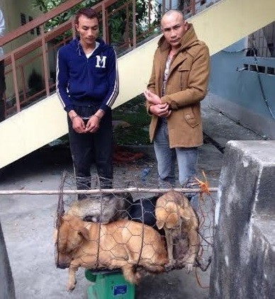 Theo đó, vào lúc 1h sáng ngày 2/11, trong lúc đang tuần tra kiểm soát trên địa bàn khối 8, phường Mai Hùng, TX Hoàng Mai (Nghệ An), công an TX Hoàng Mai đã bắt quả tang 2 đối tượng Trần Đình Tài (1994) và Trần Đình Tú (1984) đều trú tại xóm 6, xã Quỳnh Lộc, (Quỳnh Lưu, Nghệ An) đang bán chó cho quán thịt chó Thái Thanh.