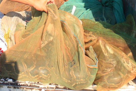 Trên chiếc xe tải, lực lượng chức năng phát hiện chở nhiều bao trăn còn sống, trong đó có nhiều con nặng tới vài chục kg.