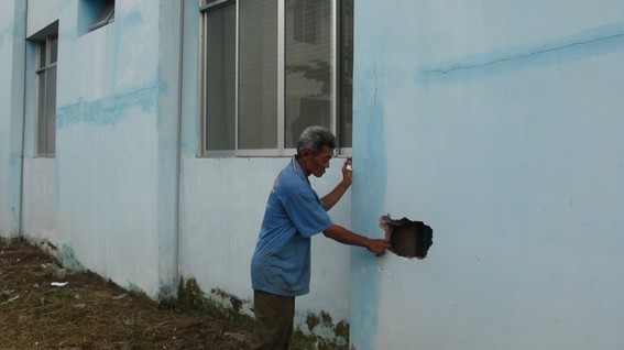 Bệnh viện Đa khoa thị xã Châu Đốc (An Giang) xuất hiện nhiều vết nứt và lỗ thủng trên tường như thế này - Ảnh: Đ.Vịnh