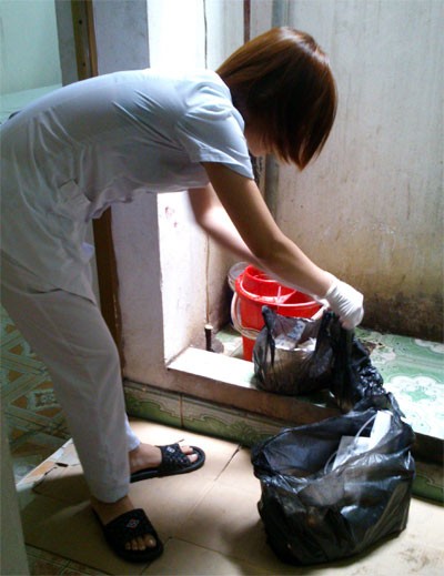 Chất thải y tế gồm: sơ ranh, bông băng dính máu, lọ thuốc.... được Phó Giám đốc Phòng khám đa khoa phía Nam (934-936 Trương Định, quận Hoàng Mai, Hà Nội) chỉ đạo nhân viên thu gom, vứt ra trước cửa, chờ công nhân công ty vệ sinh môi trường đến thu gom, đổ lẫn với rác thải sinh hoạt.