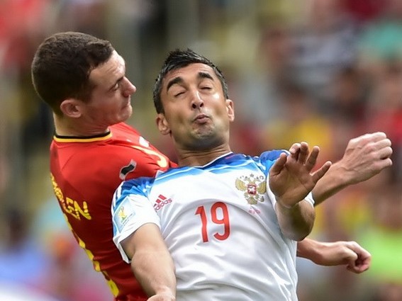 Hậu vệ Thomas Vermaelen trong một pha tranh bóng với tiền đạo Alexander Samedov (phải) đội tuyển Nga. (Nguồn: AFP/TTXVN)