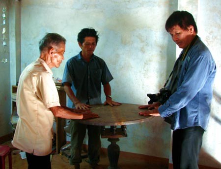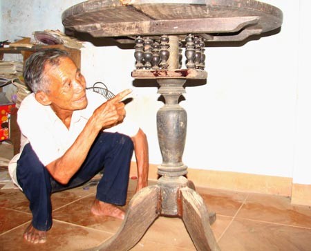 Hồi đó, mấy anh làm văn hóa tỉnh chở lên cho tui coi hai chiếc bàn gỗ mặt tròn đã bị hư, đường nét chạm khắc khá tinh xảo đúng là đồ mộc của người làng Văn Hà đóng xưa kia nên tui nhận lời. Sửa sao cho đặt tay lên mặt bàn thì mặt bàn tự xoay tròn. Sửa xong, dưới tỉnh cho ôtô lên chở đi triển lãm".