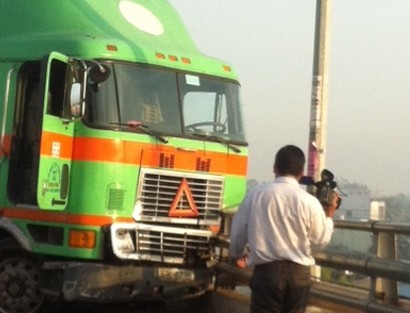 Tại hiện trường, chiếc xe đầu kéo bị bẹp dúm phần đầu xe. Rất may, vụ tai nạn không gây thương vong về người.