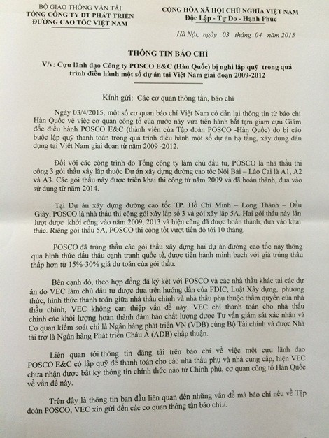 Thông cáo của VEC cũng khẳng định, POSCO đã trúng thầu các gói thầu xây dựng hai dự án đường cao tốc này thông qua hình thức đấu thầu cạnh tranh quốc tế, được tiến hành minh bạch với giá trúng thầu thấp hơn từ 15%-30% giá dự toán của gói thầu.