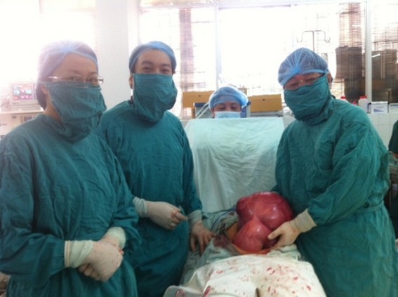 Ngày 27/12, các bác sĩ đã tiến hành phẫu thuật cho bệnh nhân. PGS.TS Tuyên cho biết, khối u “siêu khủng” của chị T. đã chèn ép lên tận dạ dày, các tạng trong ổ bụng và gây dính ruột. Các mạch máu nuôi khối u to, phì đại khoảng 1-1,2 cm, to bằng ngón tay trỏ (bình thường kích thước động mạch tử cung chỉ bằng 0,1 – 0,2 cm) chạy ngoằn nghèo, chỉ cần sơ suất, làm vỡ mạch, dễ gây chảy máu ào ạt, nguy hiểm tới tính mạng bệnh nhân.