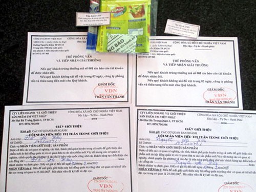 Phiếu bốc thăm trúng thưởng và gói trà mà kẻ gian dùng để lừa đảo.