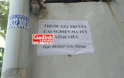 Tờ rơi quảng cáo thuốc cai nghiện rầm rộ trong các ngõ hẻm. Ảnh: DA