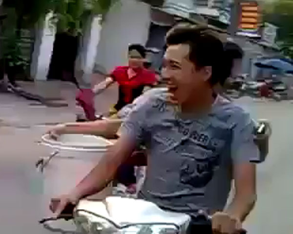 Chỉ cần một xô nước những thanh niên này đã làm rất nhiều nạn nhân nữ hoảng sợ (Ảnh chụp từ clip).