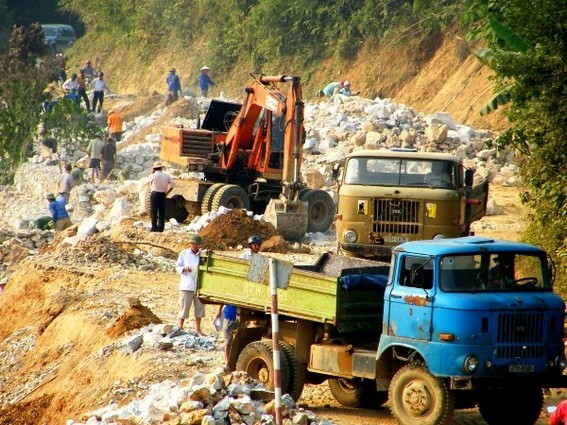 Thi công khắc phục điểm sạt lở trên một tuyến quốc lộ. (Ảnh: TTXVN)