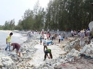 Làm kè chống sạt lở đê biển. (Ảnh: Quốc Việt/TTXVN)