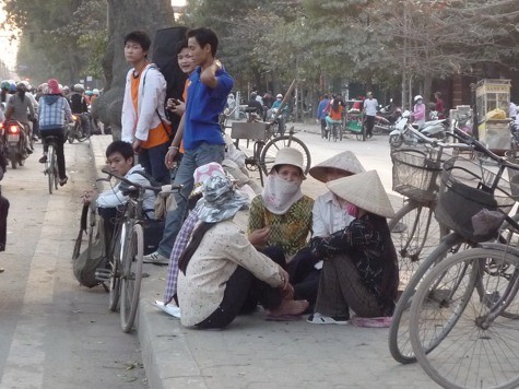 Đường Nguyễn Trãi, (quận Thanh Xuân, HN) mới 7 giờ sáng, từng nhóm lao động đã tập trung dọc từ Phùng Khoang đến bệnh viện Tuệ Tĩnh. Mỗi khi có xe máy nào tấp vào, họ lại ùa ra tranh nhau “mời chào”. Đào móng nhà, nạo vét kênh mương, chuyển nhà, đánh vữa, thợ xây… việc gì cũng có người sẵn sàng “xung phong”. Nhiều nữ lao động túm năm tụm ba buôn chuyện, trong khi đó cánh đàn ông người thì lang thang quán nước, người đánh bài, người vạ vật nằm ngủ trên những chiếc xe máy dựng vỉa hè…Cứ nhìn cảnh tượng này cũng đủ hiểu họ đang “đói” việc đến mức nào!.