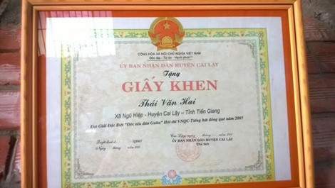 Tấm bằng khen giải “độc tấu đàn ghi ta” của ông Hai được UBND huyện Cai Lậy tặng