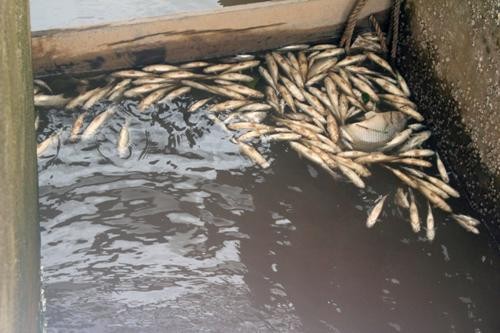 Tại hồ nước sạch của DAP, cá chết hàng loạt nổi lềnh phềnh ngay cửa cống.