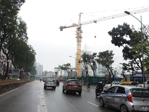 Cần cẩu thi công tại đường Đào Tấn, quận Ba Đình, tầm hoạt động thừa ra quá đường, hoàn toàn không được quây khu, cách ly.