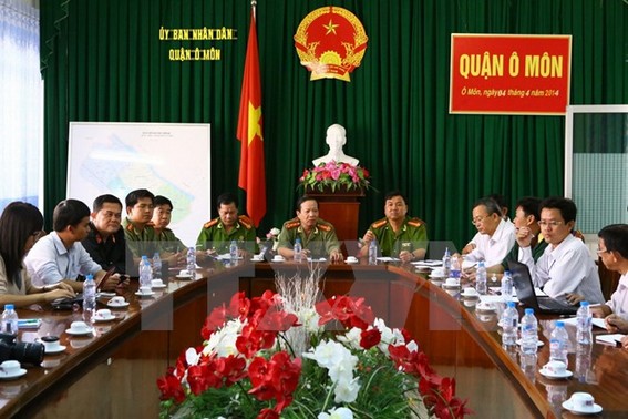 Giám đốc Công an Thành phố Cần Thơ Nguyễn Minh Kha (người ngồi giữa) phát biểu tại buổi họp báo về vụ việc. (Ảnh: Duy Khương/TTXVN)