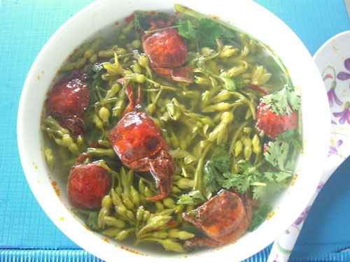 Rạm có thể làm nhiều món, như: um, rang me, làm mắm, nhưng có lẽ món canh rạm đồng bông thiên lý là món ăn dân dã mà vị ngọt của nó khó ai có thể cầm lòng. Muốn nấu món canh này, trước hết phải ra vườn hái hay ra chợ mua một ít bông thiên lý đem về ngâm qua nước muối pha loãng để hạn chế trứng sâu bọ, tiếp theo bóc cái yếm của rạm, ngắt bỏ phần chân, rửa sạch rồi ướp với bột ngọt, mắm, tiêu, hành tím đập dập... Để rạm thấm gia vị khoảng mười lăm phút, sau đó phi dầu nóng lên cho rạm được ướp vào. Khi thấy rạm săn giòn và ngả vàng, đổ nước sôi để nguội vào đun. Khi nước trong nồi reo lên, cho bông thiên lý vào rồi chờ nước sôi bùng lên, tắt bếp là có một nồi canh thơm phức.