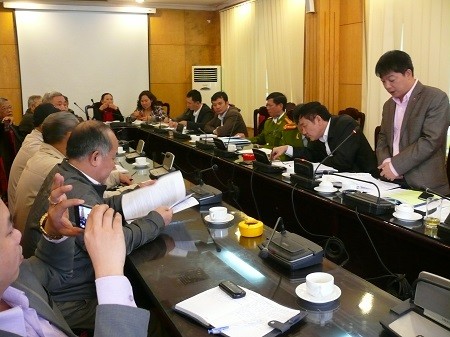 Ông Đinh Tiến Sỹ, Trưởng phòng Tài nguyên và Môi trường quận Thanh Xuân (người đứng phát biểu) cùng lãnh đạo quận trong buổi tiếp xúc đại diện các hộ dân. Ảnh: Thế Lữ