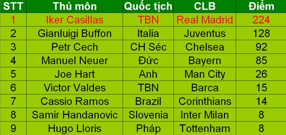 Xếp thứ 3 là người gác đền của Chelsea, Petr Cech với 92 điểm, trong khi Manuel Neuer của Bayern đứng thứ 4 khi nhận được 85 điểm. Thủ thành của ĐT Anh và Man City, Joe Hart ở vị trí thứ 5 với 26 điểm, và đồng đội của Casillas tại ĐT Tây Ban Nha, Victor Valdes xếp thứ 6 với 15 điểm.