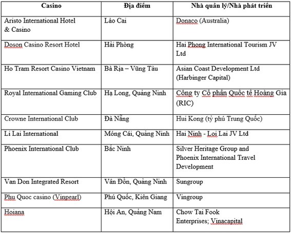 Hiện nay, Việt Nam có tổng cộng 7 casino dành cho người nước ngoài đã được cấp phép và 3 casino lớn đang triển khai xây dựng, gồm Vân Đồn (Quảng Ninh), Phú Quốc và Nam Hội An. Ngoài ra, nhiều dự án casino cũng đang rậm rịch tái khởi động hoặc xin chờ cấp phép để đón những cơ hội ưu đãi.